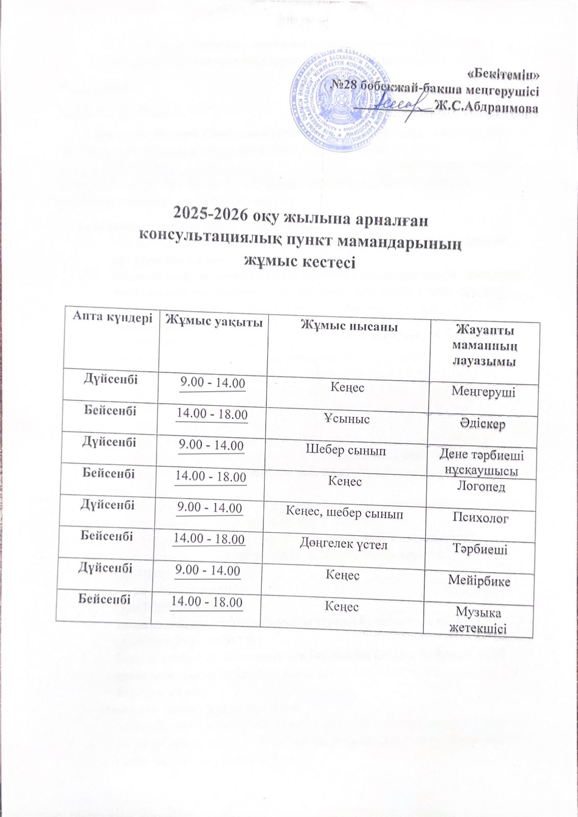 02 сентябрь 2025 0 1 2 3 4 5 2025-2026 ОҚУ ЖЫЛЫНА АРНАЛҒАН КОНСУЛЬТАЦИЯЛЫҚ ПУНКТ МАМАНДАРЫНЫҢЖҰМЫС КЕСТЕСІ